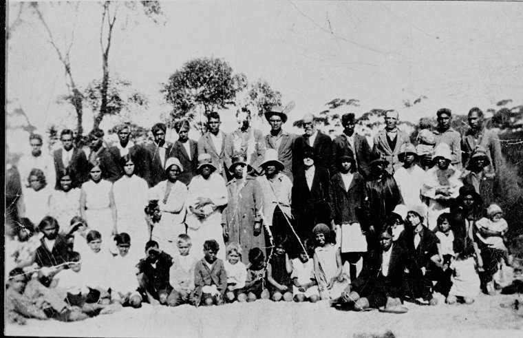 060987PD A group of Badjaling residents in the 1930s, including Len Yarran, Andrew Pickett, Charlie Winmar, Cyril Yarran, Arnold Pickett, Lionel Yarran, Morton Hansen, Billl Garlett, snr., Mantle Winmar, Jack Websdale, Clem Yarran (holding baby Fay Yarran