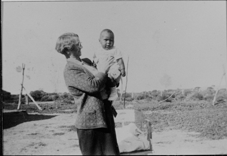 060972PD Ken Garlett, eldest son of Bill and Alma Garlett, being held by a Badjaling missionary in 1930.