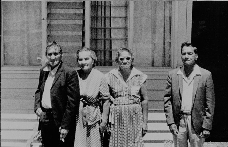 061191PD Badjaling people Algie Kickett, Gladys Blurton (nee Kickett), Edna Winmar (nee Kickett) and Oliver Kickett at Quairading in the 1970s