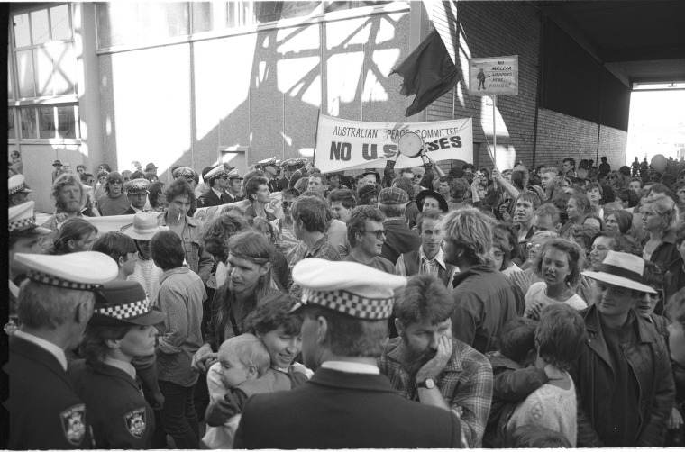 296405PD: An Australian Peace Committee banner is held aloft during an antinuclear demonstration, Fremantle, 1980