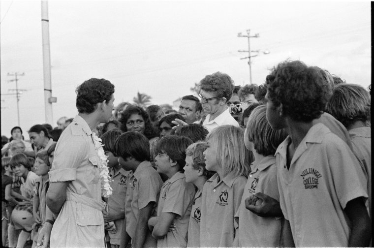 297235PD: From Nulungu Catholic College in front right to left: unknown, unknown, Stephen Albert, Damien Ryan, Michael Martin, Johari Bin Demin, Courtney Hamaguchi, Prince Charles, boy peeking out at left is Dale Hamaguchi, 22 March 1979