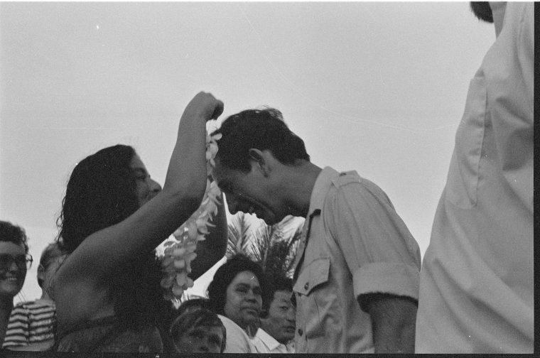 297242PD: Prince Charles is presented with a lei in Broome, 22 March 1979