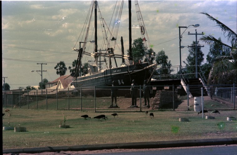 371208PD: Chinatown, Broome, 1977. The lugger Sam Male and statues of pearling identities