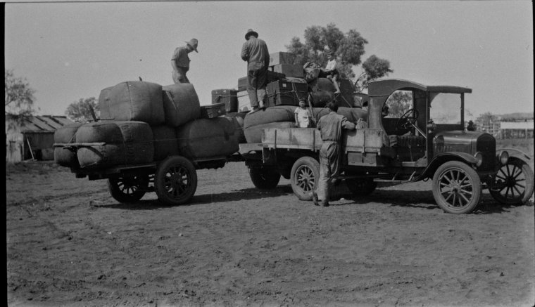 067176PD: Shearers loading vehicles with the wool clip at Lyndon Station, 1922