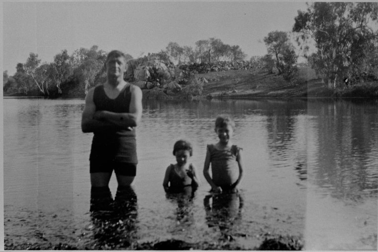067184PD: Hubert, Lorna and Brian Brockman in the Lyndon River, ca 1926