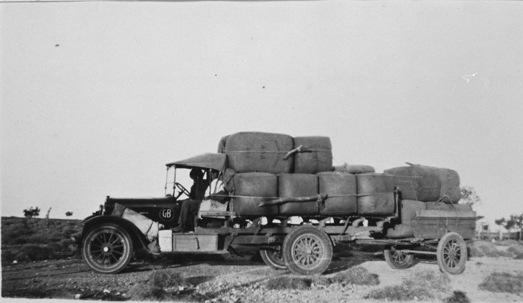 067331PD: First truck to take wool from Corunna driven by Mr Campbell, 1923