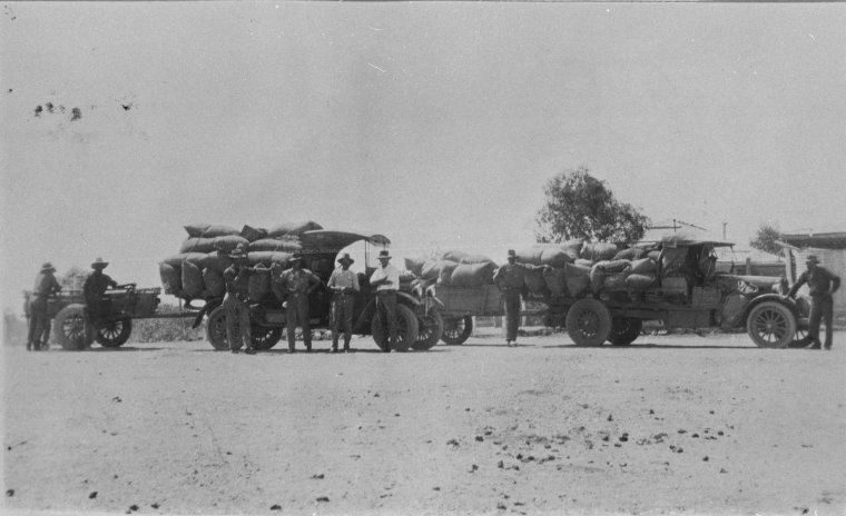 067355PD: Vehicles loaded with chaff etc at Corunna Downs, 1920s