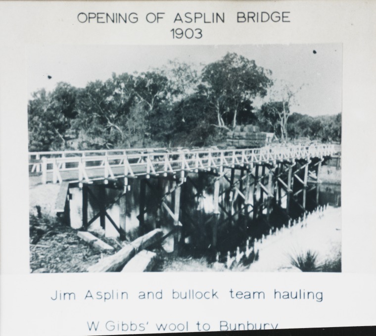 BA2670/2: Jim (James Richard) Asplin hauling W. Gibb's wool to Bunbury over the newly opened Asplin Bridge, 5 July 1902 (not 1903 as in title on photograph)