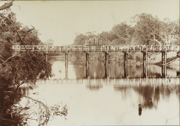 BA2670/3: Settlers assembled on the newly opened bridge with bullock team and wool cart, 5 July 1902