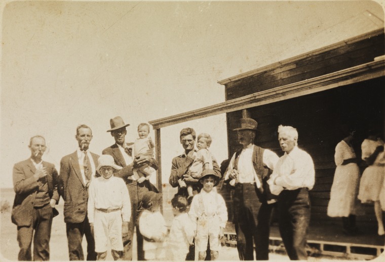 BA2670/8: At Badgebup. Back row L to R: George Goodchild, Joe Johnson, Jack Smith with James, Fred Asplin with John Goodchild, Stan Hollibone, James Asplin. Front: Harvey Johnson, ?, Bob Johnson, George Goodchild Jnr., 28 December 1924