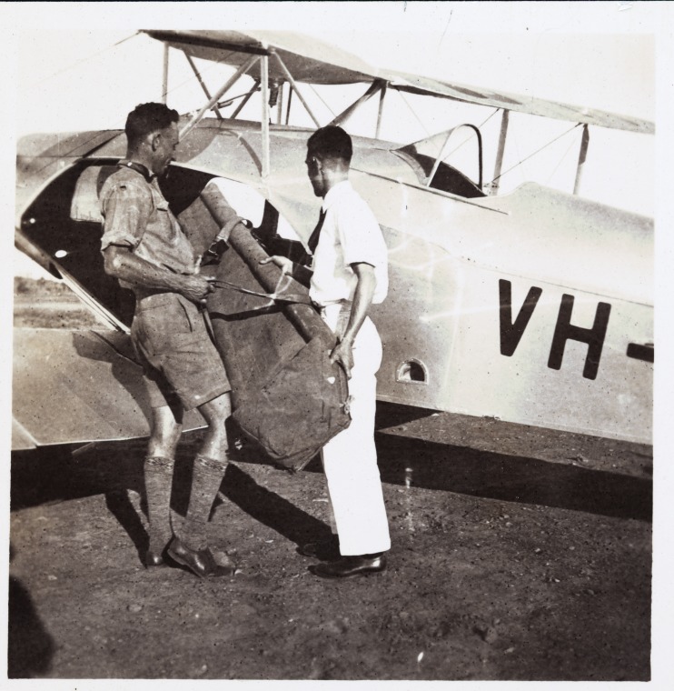 BA2078/3: Dr R.J. Coto and pilot taking stretcher from aircraft Wyndham 1935