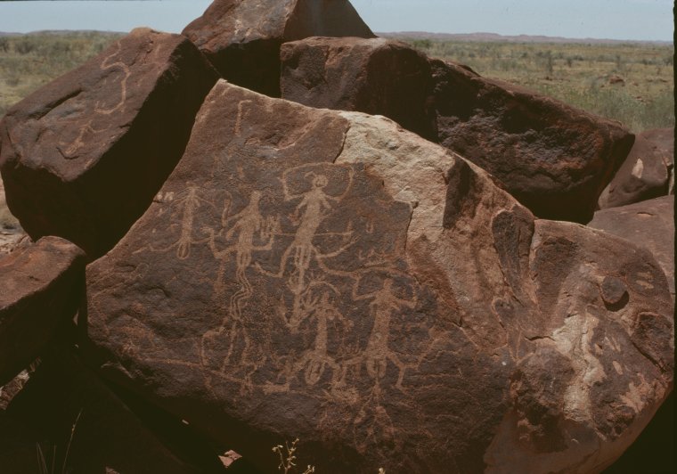 140681PD: Aboriginal rock art along the Mt. Newman Iron Ore Railroad, 187km, 1975?