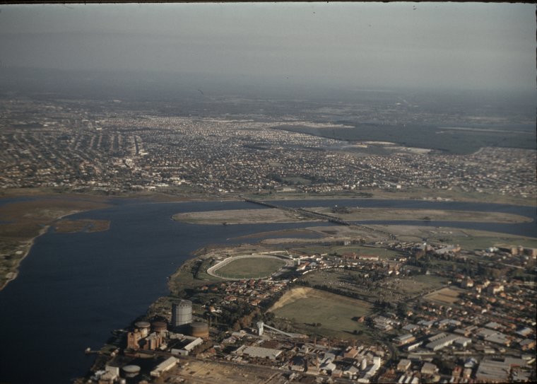 135807PD: By plane to Rottnest Island, 1950s. Aerial view of East Perth, the Causeway and Victoria Park