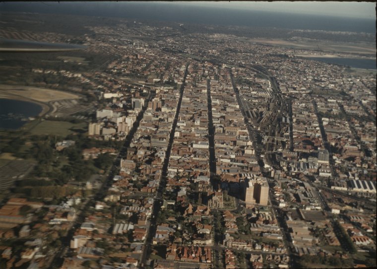 135809PD: By plane to Rottnest Island, 1950s. Aerial view of East Perth, Perth CBD and Northbridge looking west