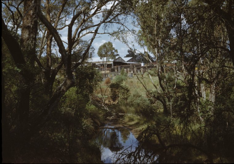 135967PD: The mill at Nyamup peeping thro' the trees from the other side of Wilgarup Brook, 1955