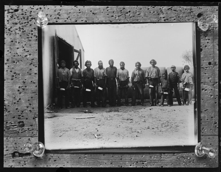 014949PD: An Aboriginal shearing team with hand blades, 1911