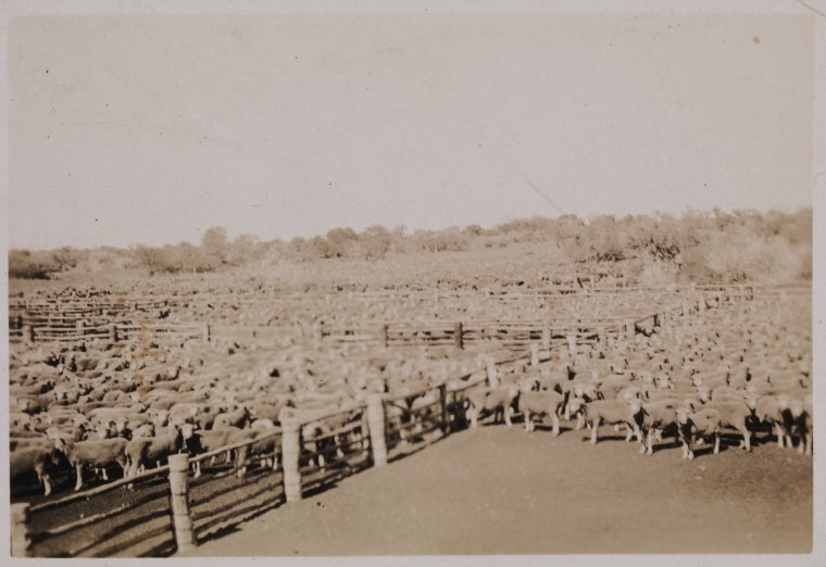 12,000 ewes and 3,000 lambs in yards at Jimba Jimba Station, Gascoyne River, ca 1926.