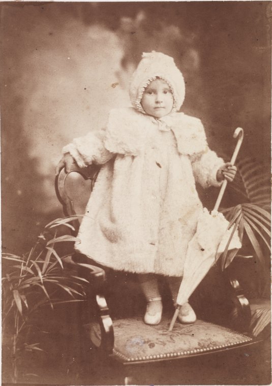Marjorie Armstrong aged 2 or 3, with parasol and fur coat.