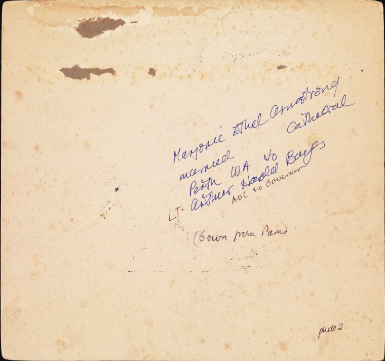 Marjorie Ethel Armstrong in wedding gown, December 1924 (reverse).