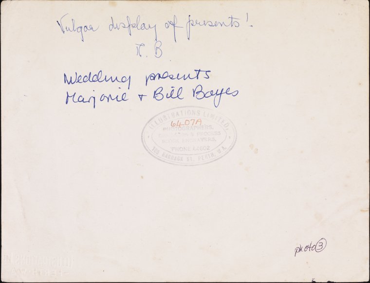 Wedding presents of Marjorie and Bill Boyes displayed at 'San Dalmas', Mount Lawley (reverse).