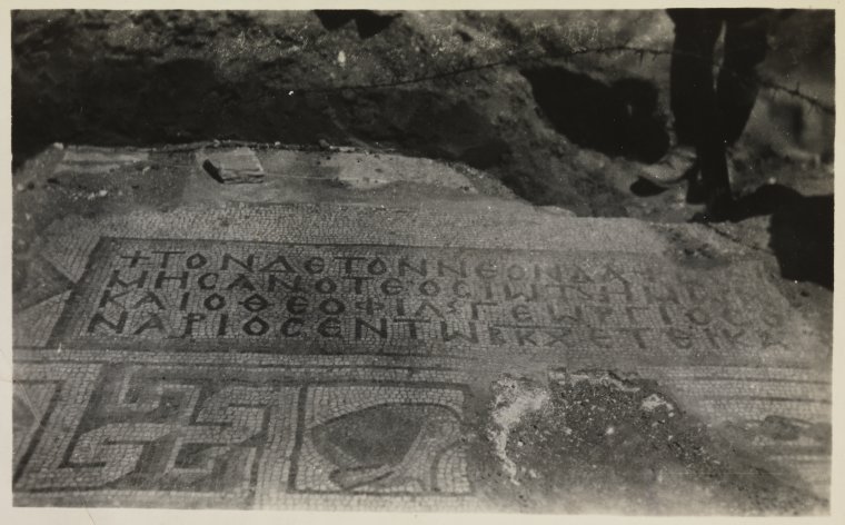 BA2629/44: Caption provided by donor, possibly written on reverse of postcard: "These six [five] photos are of an old ancient floor in a mosque up in the waddi near our camp. Note the animals, birds, etc. built in with different stones. It is well done an