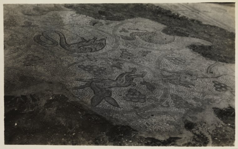 BA2629/45: Caption provided by donor, possibly written on reverse of postcard: "These six [five] photos are of an old ancient floor in a mosque up in the waddi near our camp. Note the animals, birds, etc. built in with different stones. It is well done an