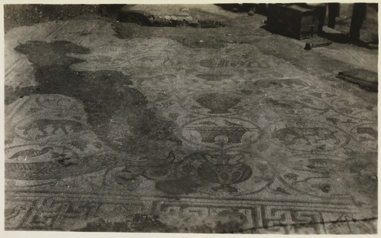 BA2629/46: Caption provided by donor, possibly written on reverse of postcard: "These six [five] photos are of an old ancient floor in a mosque up in the waddi near our camp. Note the animals, birds, etc. built in with different stones. It is well done an