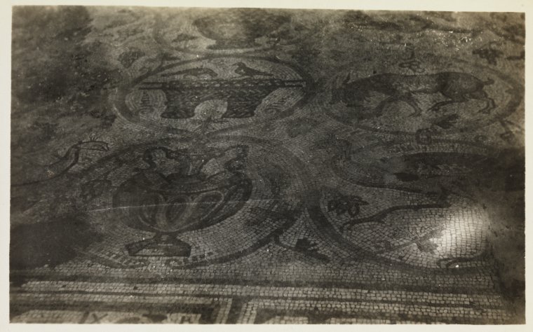 BA2629/47: Caption provided by donor, possibly written on reverse of postcard: "These six [five] photos are of an old ancient floor in a mosque up in the waddi near our camp. Note the animals, birds, etc. built in with different stones. It is well done an