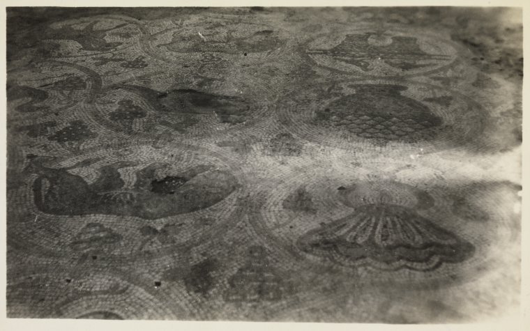 BA2629/48: Caption provided by donor, possibly written on reverse of postcard: "These six [five] photos are of an old ancient floor in a mosque up in the waddi near our camp. Note the animals, birds, etc. built in with different stones. It is well done an