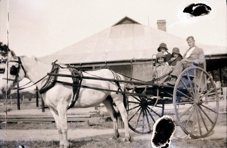 Reg Paynter with Elizabeth and Doreen Hettner in sulky, ca 1936.