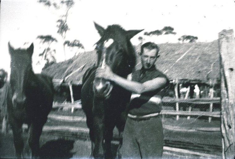 Reg Paynter with horses at stables, ca 1935.