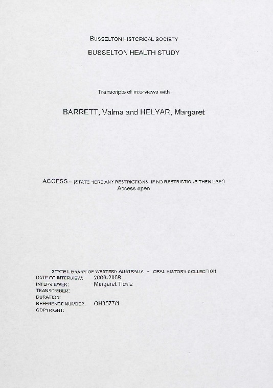 OH3577/4 Transcript. Interviews with Valma Barrett & Margaret Helyar in 2006-2008 by Margaret Tickle