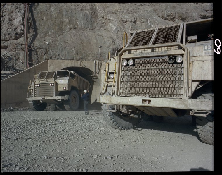 320385PD: Trucks moving ore at Teutonic Bore mine, 1983