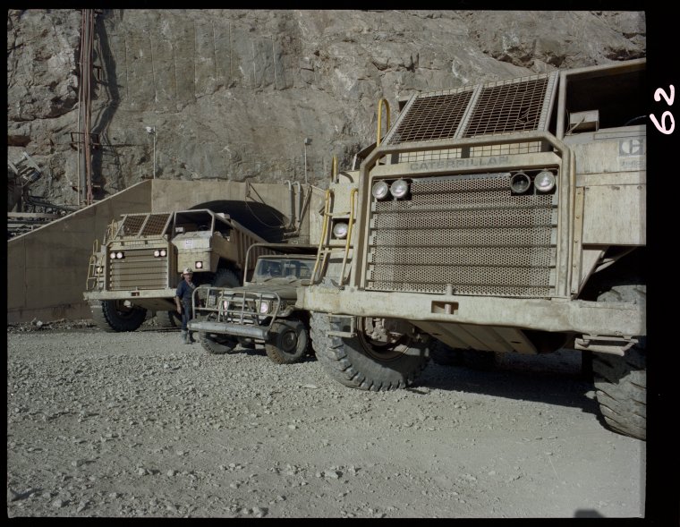 320386PD: Trucks moving ore at Teutonic Bore mine, 1983