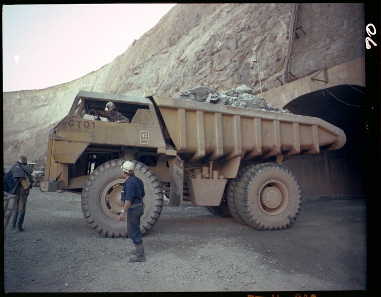 320391PD: Truck hauling ore out of Teutonic Bore mine, 1983