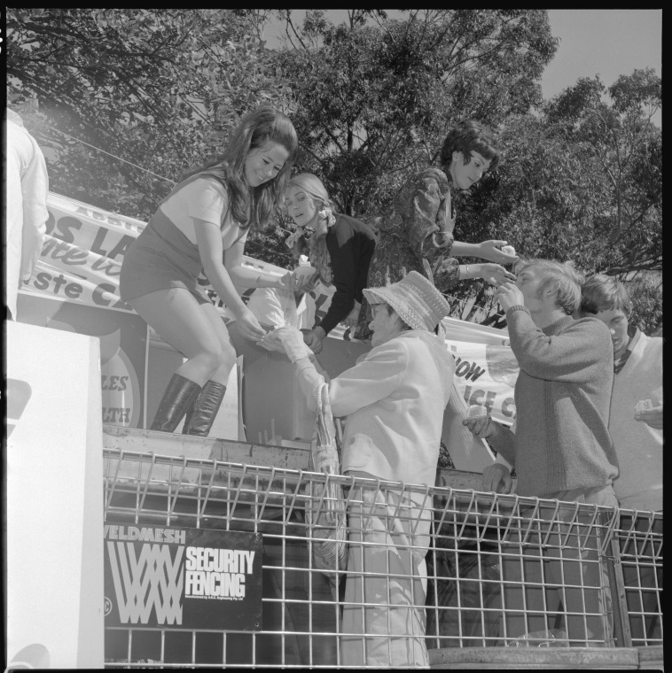 344385PD: Handing our apple pie at the Apple Week 1970 concert in Supreme Court Gardens, April 1970