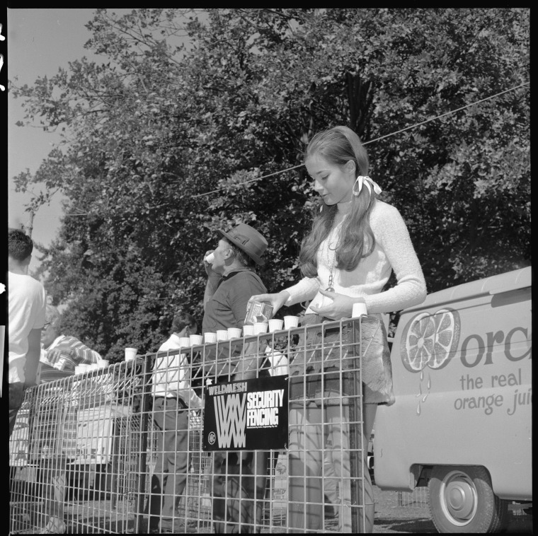 344386PD: Giving out samples of apple juice at Apple Week 1970, Supreme Court Gardens, Perth, April 1970