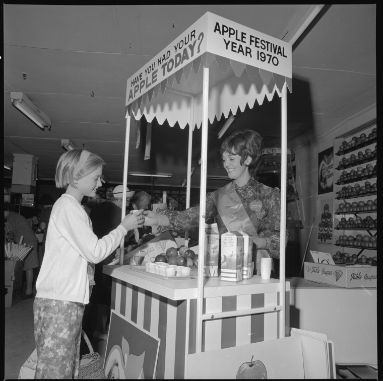 344388PD: Apple Queen Lynette Foti distributes samples of apple juice during Apple Week, Perth, April 1970