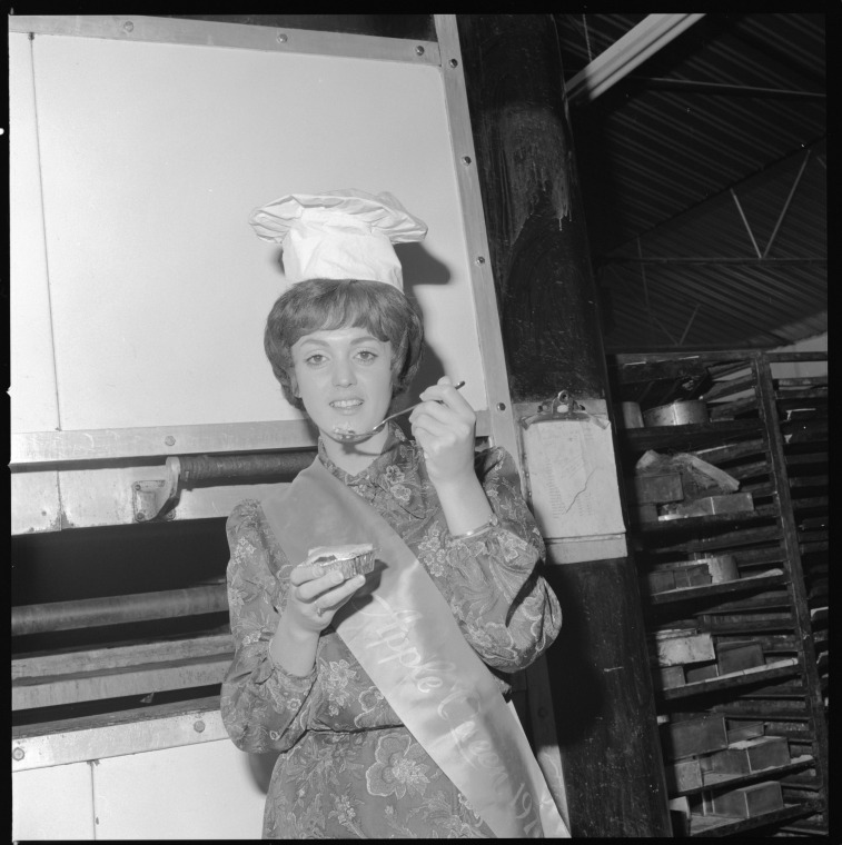344377PD: Apple Queen Lynette Foti samples the worlds largest apple pie, April 1970