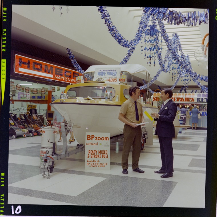 327361PD: Displays advertising BP ready mixed 2-stroke fuel at Karrinyup Shopping Centre, 1973