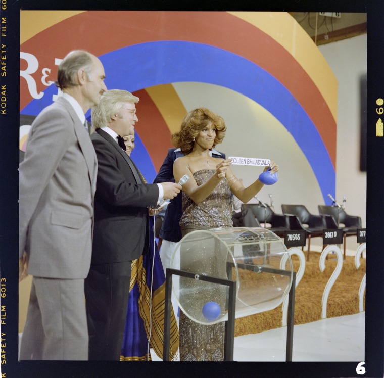 327886PD: A participant draws the name Colleen Bhiladvala from the barrel during the Drawing of the first Magic Million lottery in the studios of Channel 9, Perth, 1 April 1976. Colleen can just be seen wearing a sari behind the man at centre