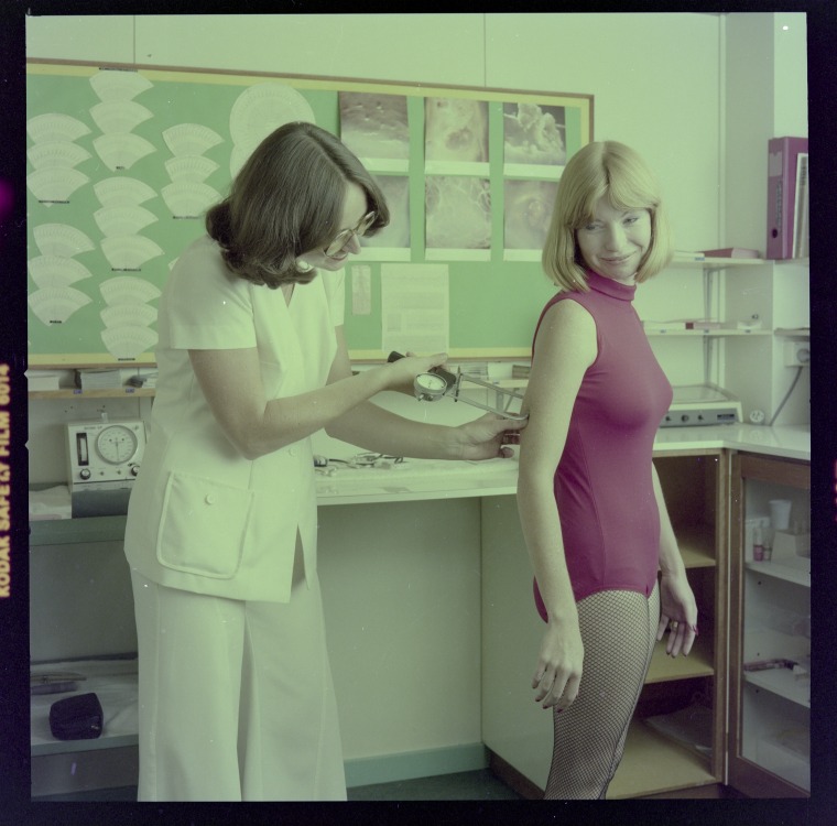 328161PD: Checking bodyfat using skinfold calipers at Laurie Potters Health Club, Perth, 1 April 1977