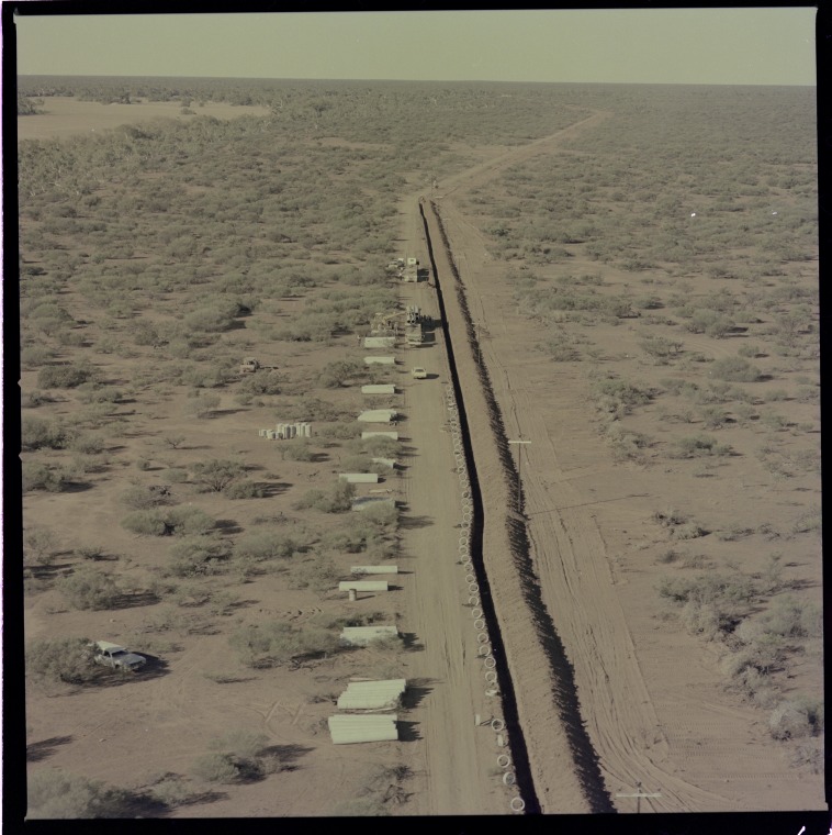 328399PD: Laying asbestos-cement pipes made by James Hardie, near Carnarvon, 9 May 1977