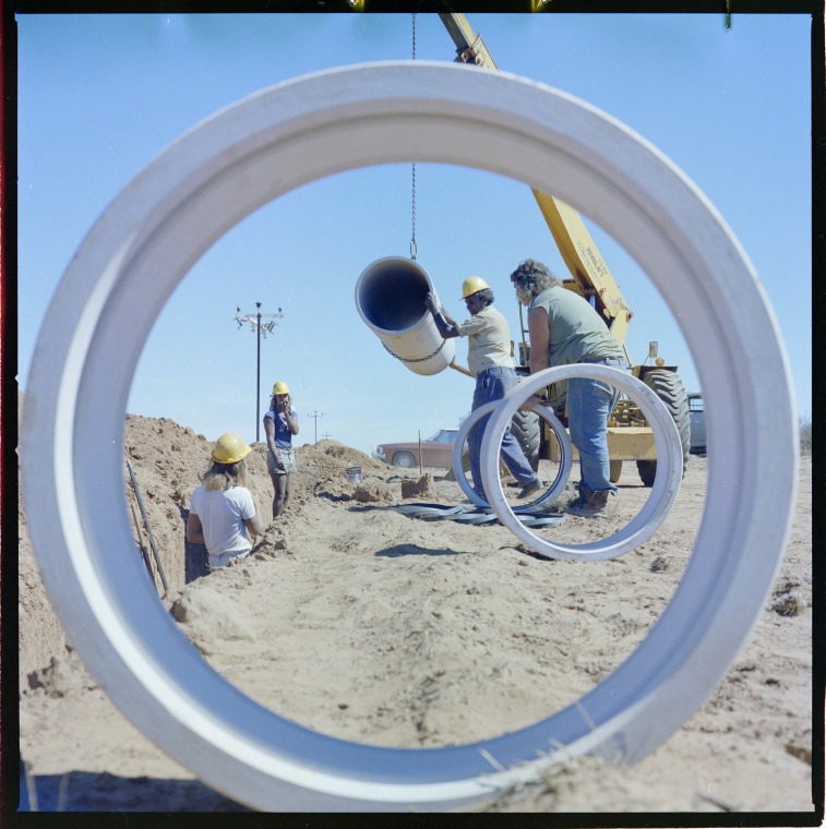 328408PD: Laying asbestos-cement pipes made by James Hardie, near Carnarvon, 9 May 1977