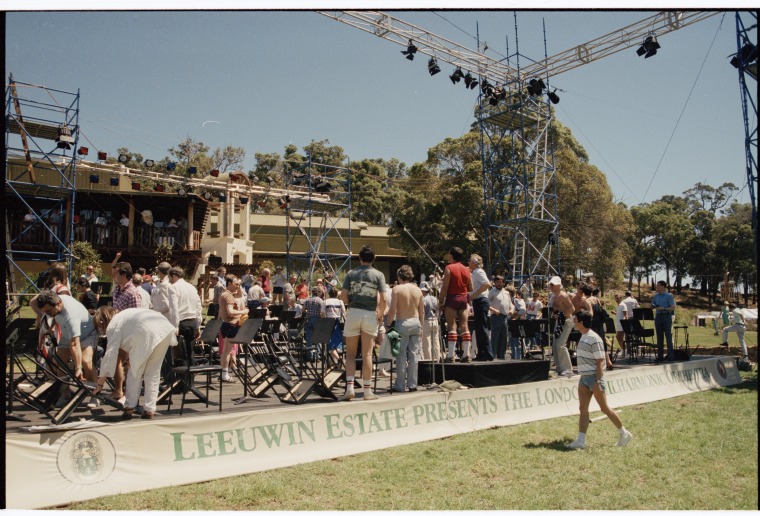 370034PD: Preparing the stage for the David Helfgott and the London Philharmonic Orchestra concert at Leeuwin Estate, 23 February 1985