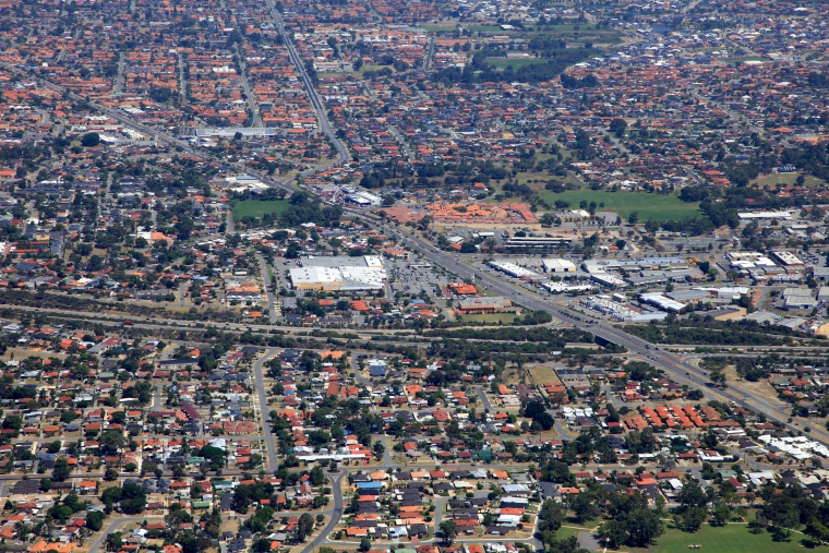 IMG 1148: Stirling Central shopping centre, Westminster (centre), Wanneroo Rd, Stirling Gate Commercial Centre, Balcatta (right), 23 February 2012