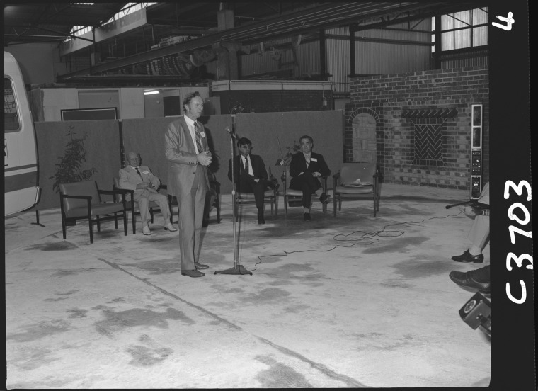 325742PD: David Palandri of CSR presents Leederville College of TAFE with a bus on behalf of CSR Building Materials, 29 May 1986