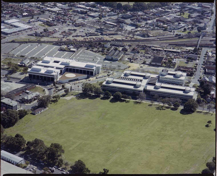 324626PD: Wellington Square, East Perth, 10 August 1987. At centre is the Education Dept. of W.A., at left the Health Dept. of W.A. in Royal Street.