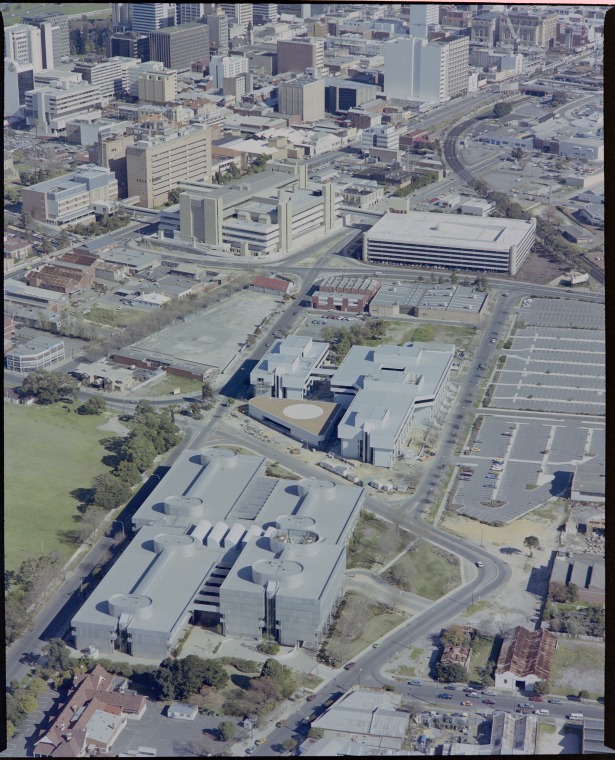 324627PD: Across East Perth to the city, 10 August 1987. The Education Dept. of W.A. in foreground