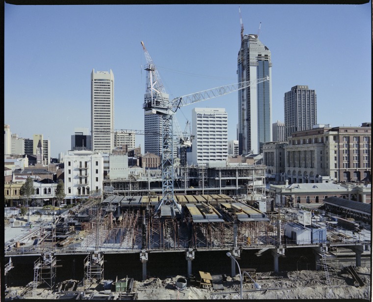 324633PD: Constructin underway over the Perth Railway Station (foreground) and the new Myer department store (background), 10 August 1987